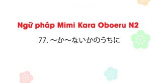 Ngữ pháp Mimi Kara Oboeru N2: 77. ~か~ないかのうちに 77. ~か~ないかのうちに (ka~nai ka no uchi ni) a. Ý nghĩa: Ngay lập tức, gần như là đồng thờiすぐに、ほとんど同時に b. Liên kết: 動詞の[辞書形・タ形](か)動詞のナイ形(かのうちに) Ví dụ: 1, デパートのドアが開くか開かないかのうちに、待っていた客たちはバーゲン会場に殺到した。 Ngay khi cánh cửa mở ra, những vị khách đang đứng chờ đã ùa vào. 2, …