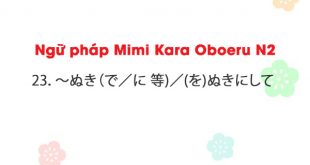 Ngữ pháp Mimi Kara Oboeru N2: 23.〜ぬき(で/に 等)/(を)ぬきにして 23.〜ぬき(で/に 等)/(を)ぬきにして a. Ý nghĩa: Loại trừ ~, không kể ~, không ~ b. Liên kết: 名詞 Ví dụ: 1, 朝食ぬきは体に悪い。 Không ăn sáng là không tốt cho cơ thể. 2, あの映画は理屈ぬきに面白い。 Bộ phim đó thú vị hết chỗ nói. 3, お世辞ぬきの批評が聞きたい。 …