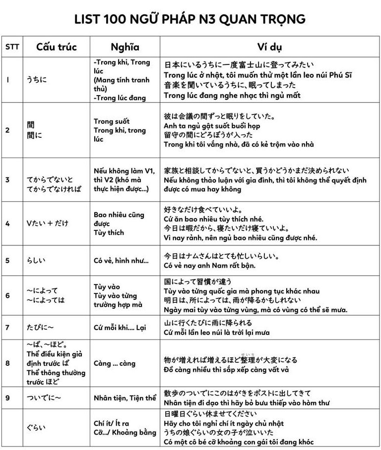 Trong bài này chúng ta sẽ cùng ôn tập nhanh 100 Ngữ Pháp N3 quan trọng.