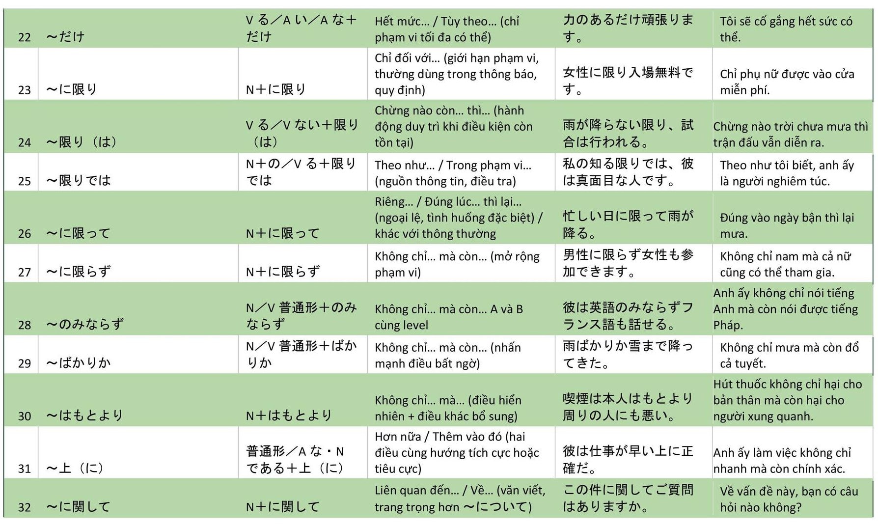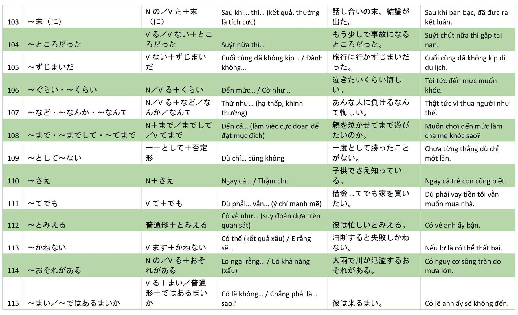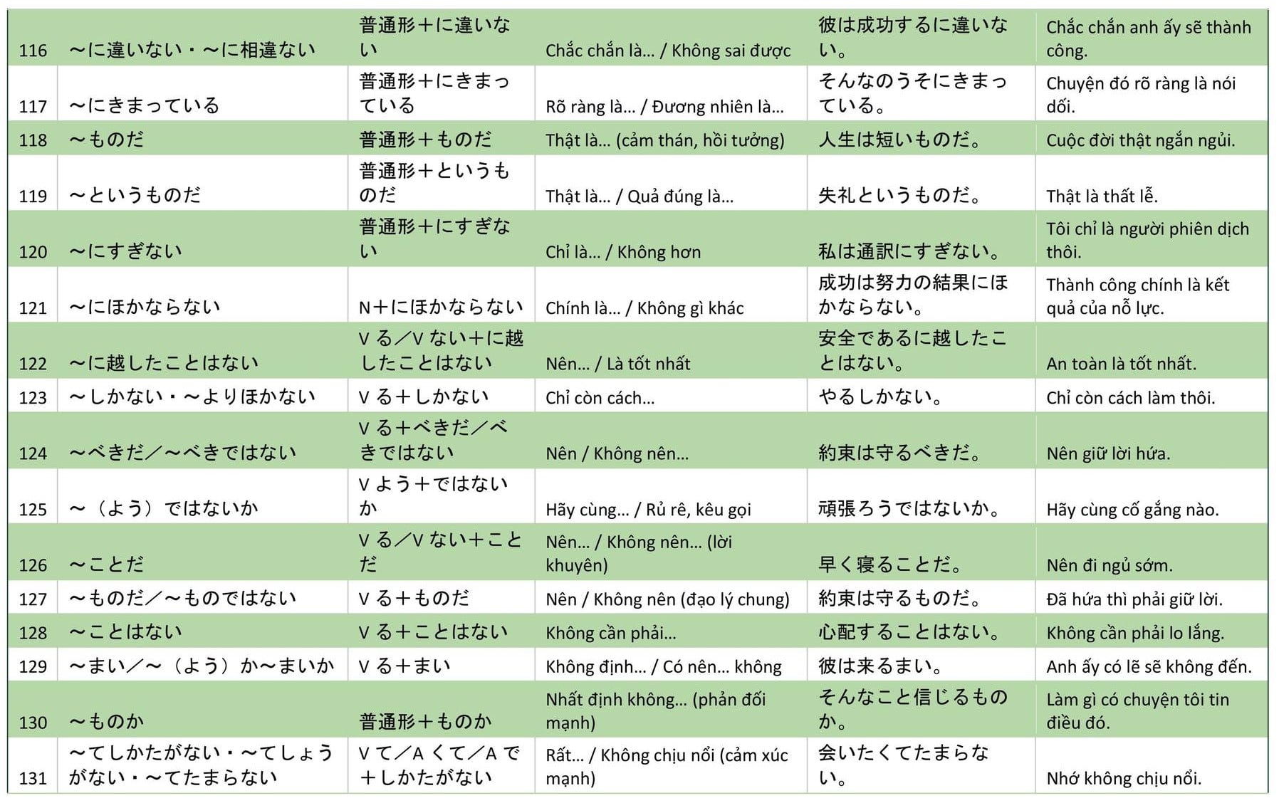 Tóm tắt 141 Cấu trúc ngữ pháp tiếng Nhật N2.